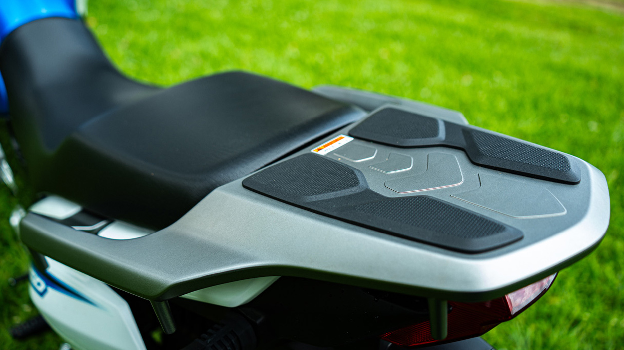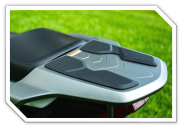 Made from lightweight and sturdy new composite materials, the rear carrier has pre-made holes for easy installation of a tail box and other accessories. It is nearly level with the passenger’s seat and includes six luggage hooks for secure and convenient item storage.