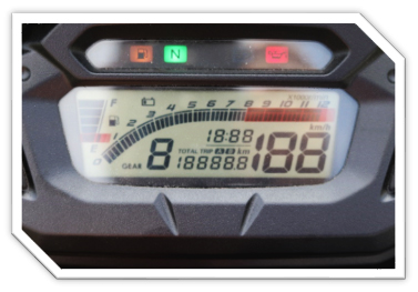 Clear, high-visibility display featuring tachometer, speedometer, gear position indicator, fuel level, clock, dual trip meters, low-voltage warning, and programmable service reminder.